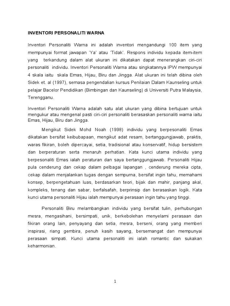 Perubahan personaliti banyak dipengaruhi oleh. Inventori ini telah dibina oleh Dr Sidek Mohd Noah dan Pelajar Sarjana Muda Bimbingan Dan Kaunseling Universiti Putra Malaysia Terengganu. Inventori Personaliti Warna atau singkatan nya IPW mempunyai 4 skala iaitu skala Alat ukuran ini telah dibina oleh Sidek 1997 semasa pengendalian kursus Penilaian Dalam Kaunseling untuk pelajar Bacelor Pendidikan Bimbingan dan Kaunseling di Univerisiti Putra Malaysia Terenggan DOWNLOAD E-BOOK.