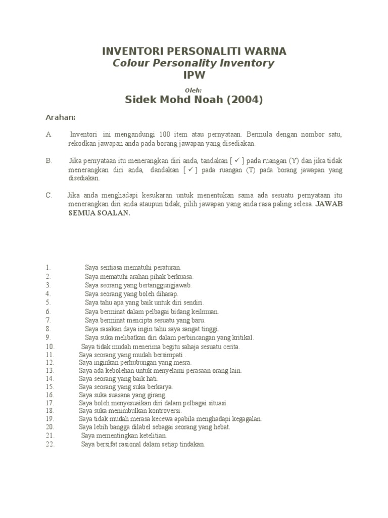 . Inventori Personaliti Sidek atau singkatannya IPS misalnya mempunyai 15 skala yang mampu mengenal pasti 15 ciri-ciri personaliti. INVENTORI PERSONALITI WARNA Colour Personality Inventory IPW Oleh. Jika pernyataan itu menerangkan diri anda hitamkan Y dan jika tidak menerangkan diri anda hitamkan T pada borang jawapan yang disediakan.